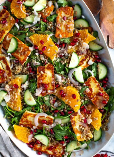 This Mediterranean-inspired halloumi salad is tossed with pomegranate, arugula, cucumbers and finished with shallot vinaigrette. I’m obsessed with this halloumi salad because View Post -