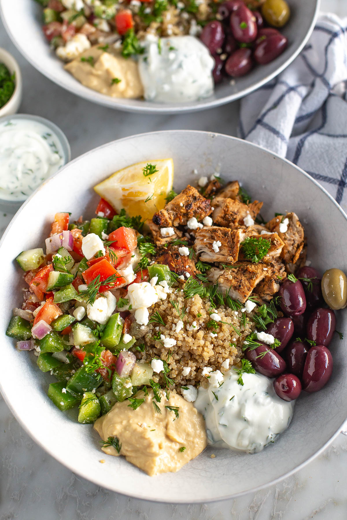 - Divide quinoa, chicken, Greek salad and other desired garnishes among 4 bowls, then serve and enjoy!