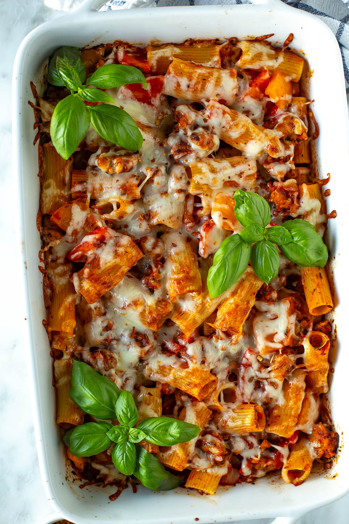 This hearty sausage pasta bake loaded with rich Italian sausage and melty cheese is perfect for feeding a crowd or for freezer meal prep.